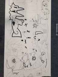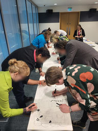 Following the presentation, the architectural educators were invited to create a collaborative drawing. They drew together standing up, on one long piece of paper, moving around the table. To begin with the academics were very quiet focusing on drawing and then they began to chat to one another, getting louder and louder. Some of the participants commented on how relaxing and therapeutic it was and that it was a good well being activity.